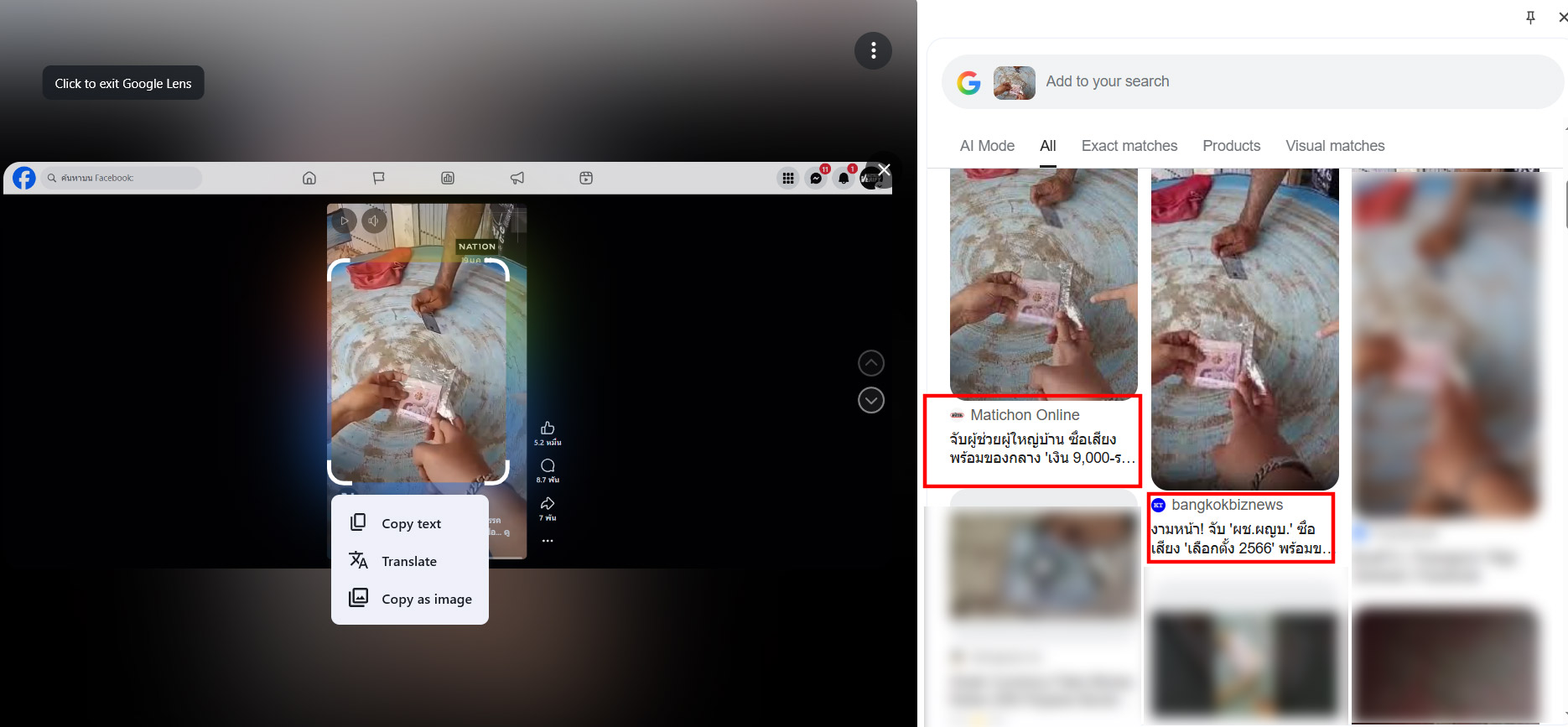 According to the investigation using the image verification tool Google Lens, it was found that the footage matches previous reports from Matichon and Bangkokbiznews, which identified the incident as the arrest of an assistant village headman for vote-buying back in 2023.
