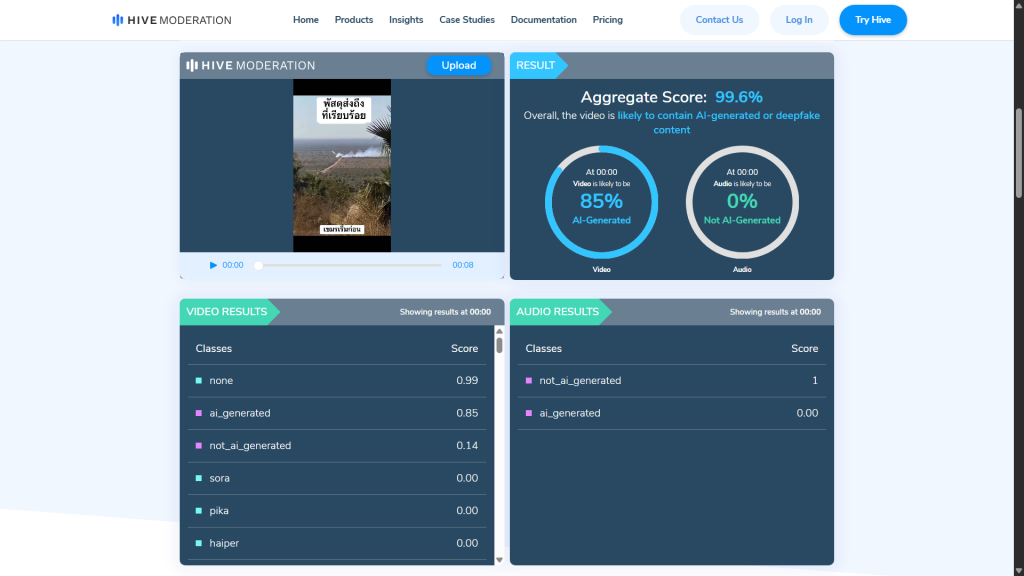 Thai PBS Verify analyzed the video using Hive Moderate, an AI-detection tool. The analysis concluded that there is a 99.6% probability that the video was generated by artificial intelligence.