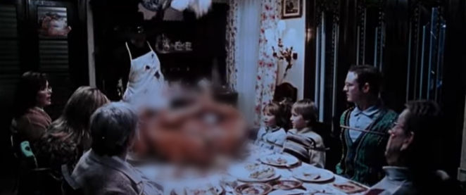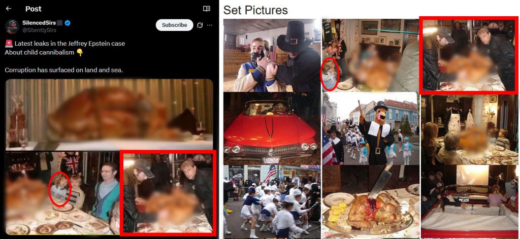 The images in question are behind-the-scenes stills from the 2007 horror film “Thanksgiving.” The scenes depict a cannibalistic feast staged as a twisted parody of a traditional Christian Thanksgiving dinner and hold no connection to the Epstein files.