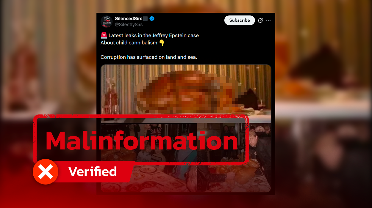 Thai PBS Verify has investigated an image shared by an X user, SilencedSirs. The post, which depicts a “human cannibalism party,” references the notorious Epstein files with the following caption: “Latest leaks in the case about child cannibalism – Corruption has surfaced on land and sea.”