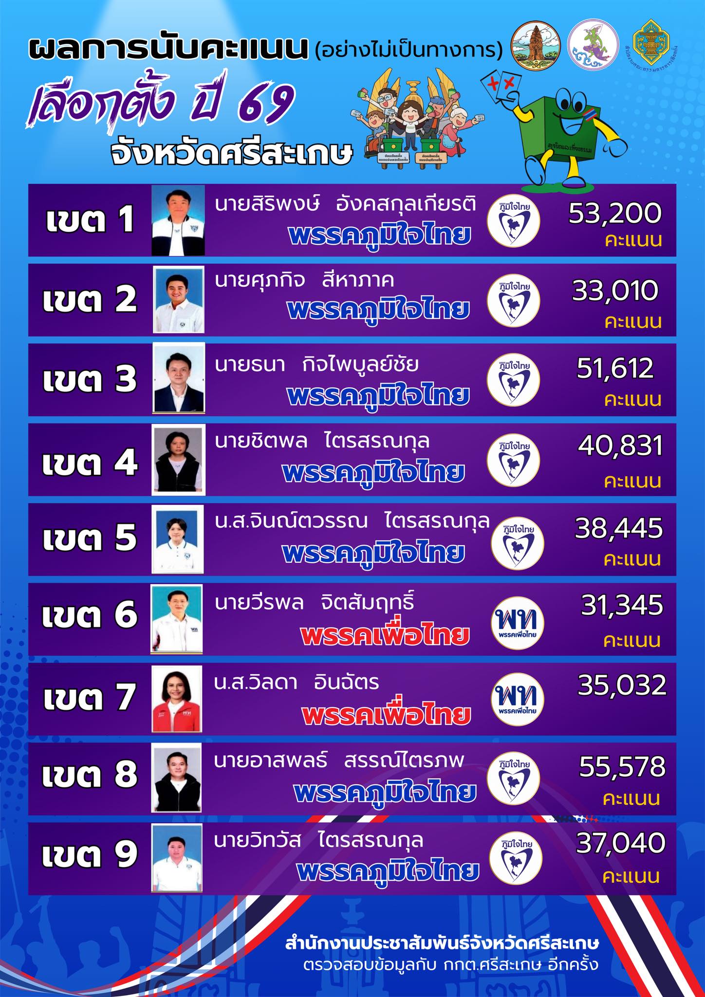 Upon checking the page of the Sisaket Provincial Public Relations Office, it reported the unofficial vote count results for Sisaket’s constituencies as of February 9, 2026, at 08:00 a.m.