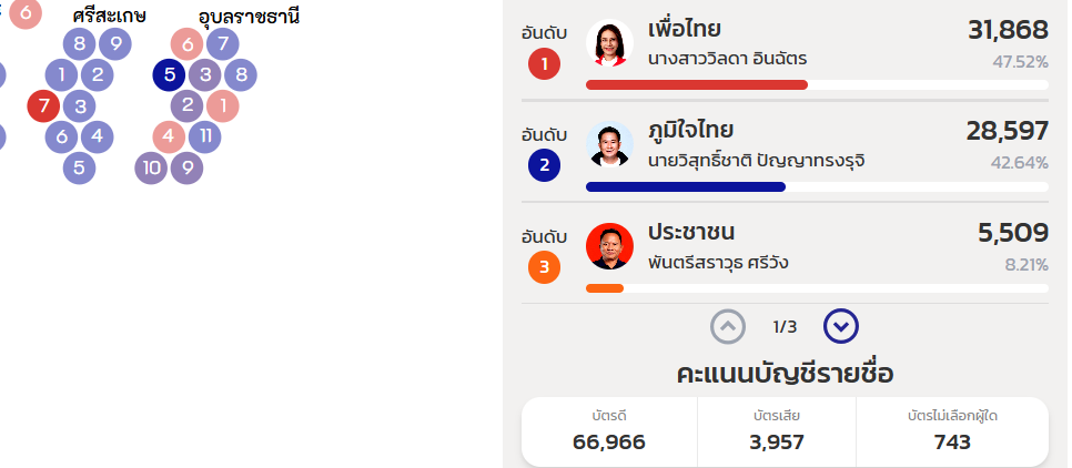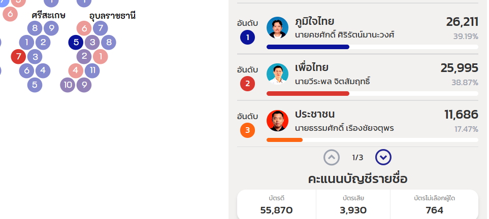 In the case where Bhumjaithai Party candidates initially appeared to lead in Sisaket’s 6th and 7th constituencies, later updates showed Pheu Thai moving into first place. This led to public misunderstanding over whether a vote recount had taken place.