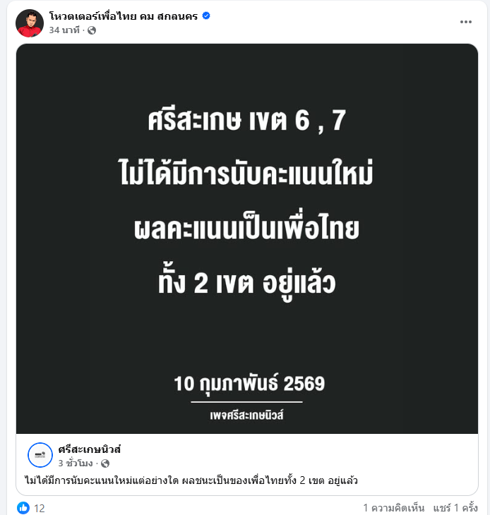 Later, Thairath TV reported on the claim under the headline: “Social media buzz! Pro-Pheu Thai social media page reveals ‘recount in Sisaket districts 6–7’ flips victory from Bhumjaithai.” It drew over 10,000 likes. The report noted, however, that the information originated only from a volunteers’ Facebook page and had not been officially confirmed by the Election Commission (EC) or senior representatives of either party.
