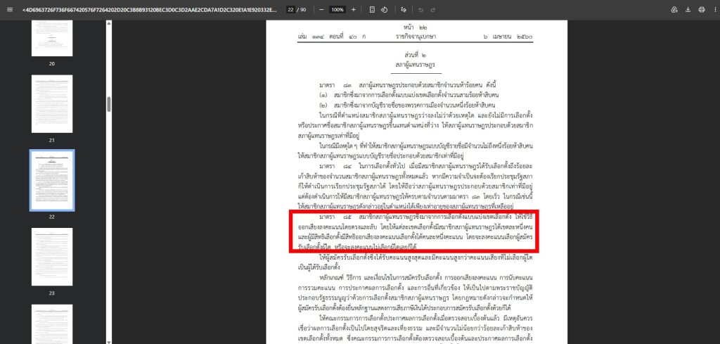 He pointed out that if such a feat were possible, it would inevitably violate the intent of Section 85 of the Constitution of the Kingdom of Thailand, B.E. 2560 (2017), which stipulates that the election of members of the House of Representatives must be “direct and secret.” This refers to the voting methods generally organized by the EC, which include registration processes, the use of polling booths, and the marking of ballots for individual candidates. This means that voters must appear in person, that they are unable to appoint others to act on their behalf, and that the casting of the vote must remain “confidential.”