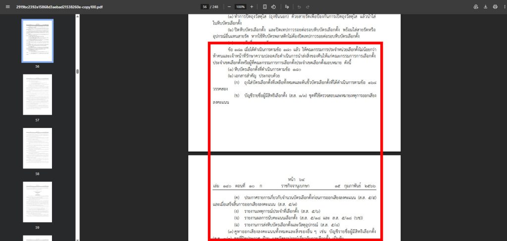 To prove the facts regarding the “separate storage” issue, Thai PBS Verify examined the “EC Regulations on the Election of Members of the House of Representatives, B.E. 2566 (2023),” which serves as the primary regulation for managing this election. The investigation found provisions within the regulations specifying the procedures for handling remaining ballots and ballot stubs after the counting process is completed, as follows.