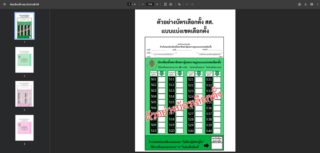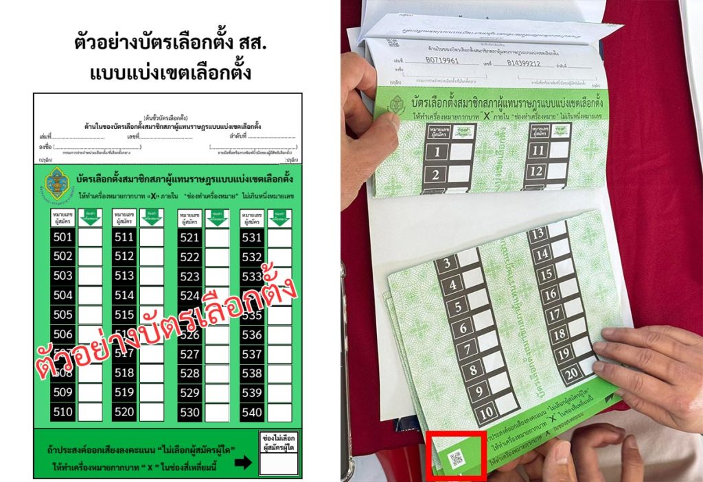 Thai PBS Verify conducted a comparison between the actual ballots and the samples used by the Office of the Election Commission (EC) for public relations before the election day. It was found that in the three sample ballots, consisting of the constituency MP ballot, the party-list MP ballot, and the referendum ballot, no barcodes or QR codes of any kind appeared in any of the previous promotional documents.
