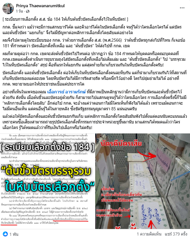 However, this clarification failed to dissipate public anxiety. Instead, it drew counter-questions from academics and the public. On his social media post, Dr. Prinya Thaewanarumitkul, professor at the Faculty of Law, Thammasat University, questioned the storage process, specifically, whether the ballots and stubs were truly stored separately as claimed. He noted that if they were not actually separated, the risk of identifying which voter chose which candidate remained.