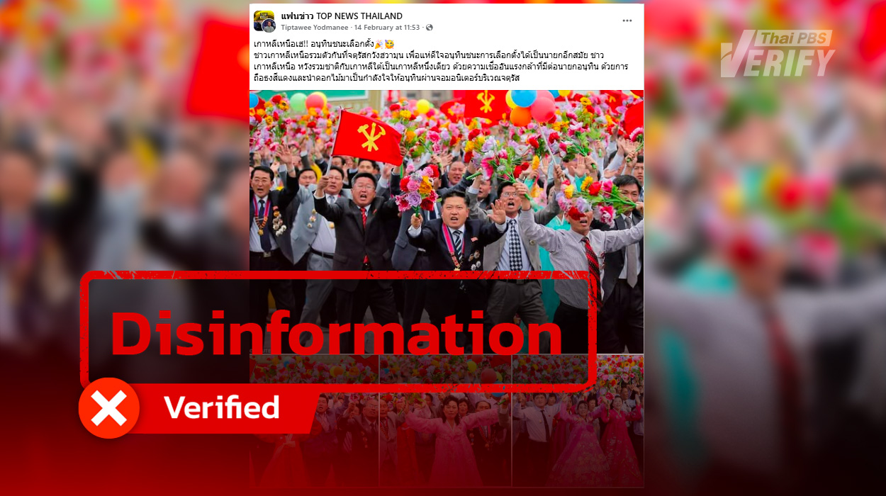 Thai PBS Verify found that the Facebook page, Fan Kao TOP NEWS THAILAND (แฟนข่าว TOP NEWS THAILAND), shared images of cheerful North Koreans. The caption reads: