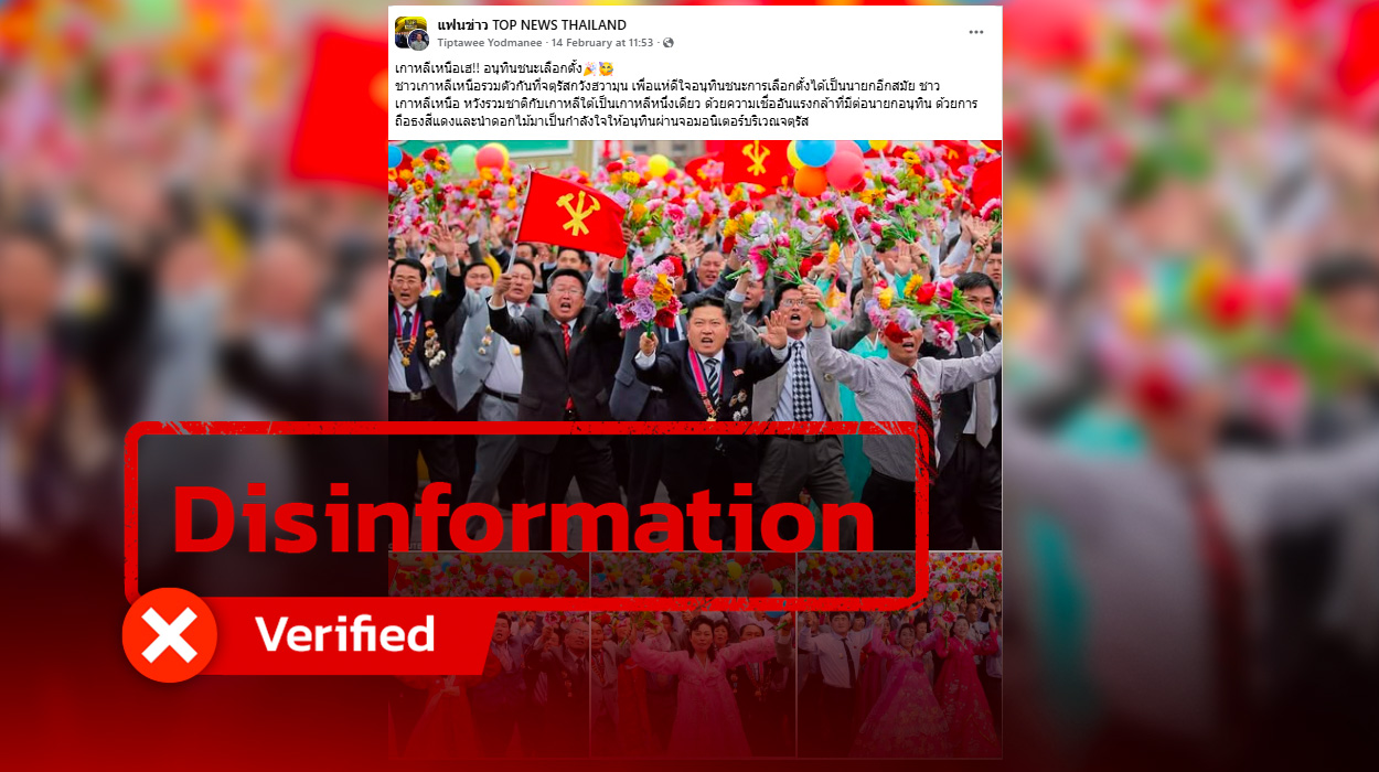 A Facebook page, Fan Kao TOP NEWS THAILAND (แฟนข่าว TOP NEWS THAILAND), shared images of cheerful North Koreans, claiming they were “celebrating that Anutin had won the election.”