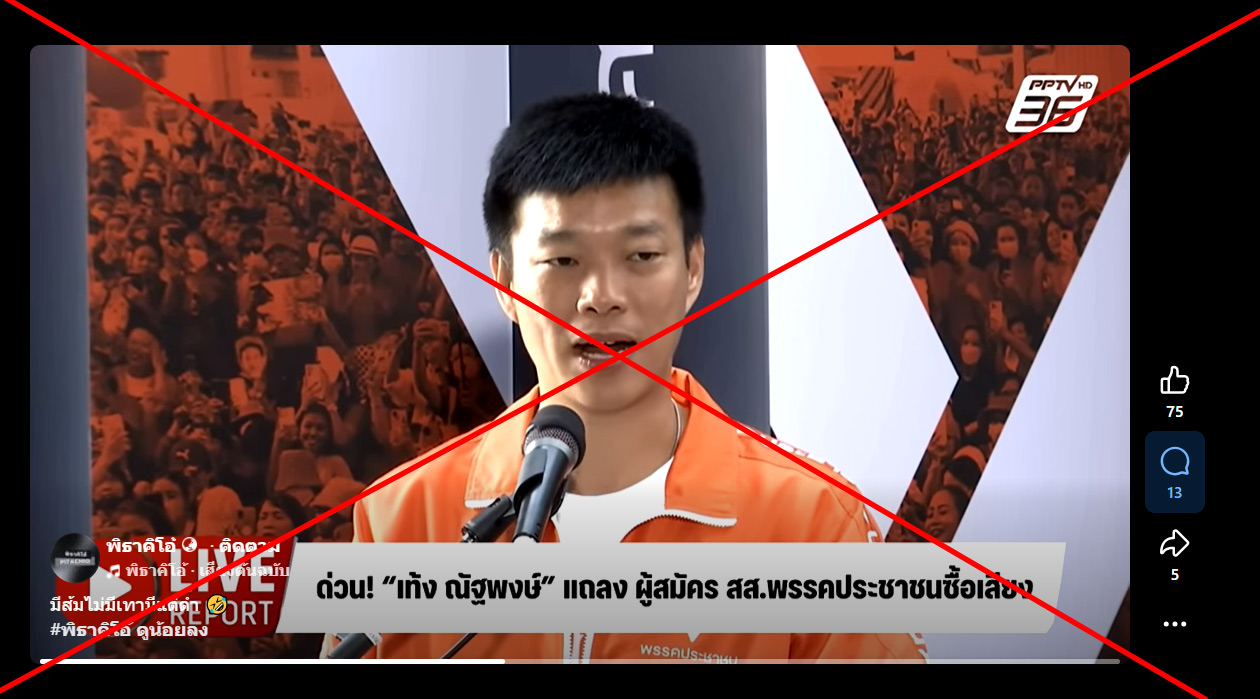A Facebook user posted a fake clip of Mr. Natthaphong making a statement on vote buying committed by the People’s Party MP. The person in the video states: