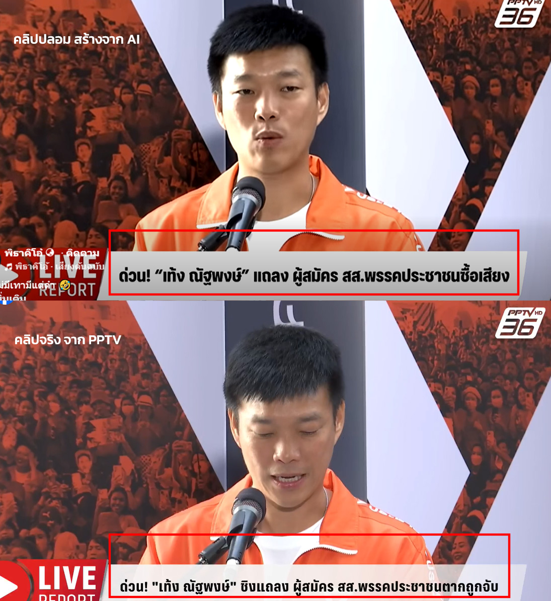 - In the AI-generated clip (above), the headline states: “Breaking news! Teng Natthaphong addresses vote buying involving People’s MP candidate”