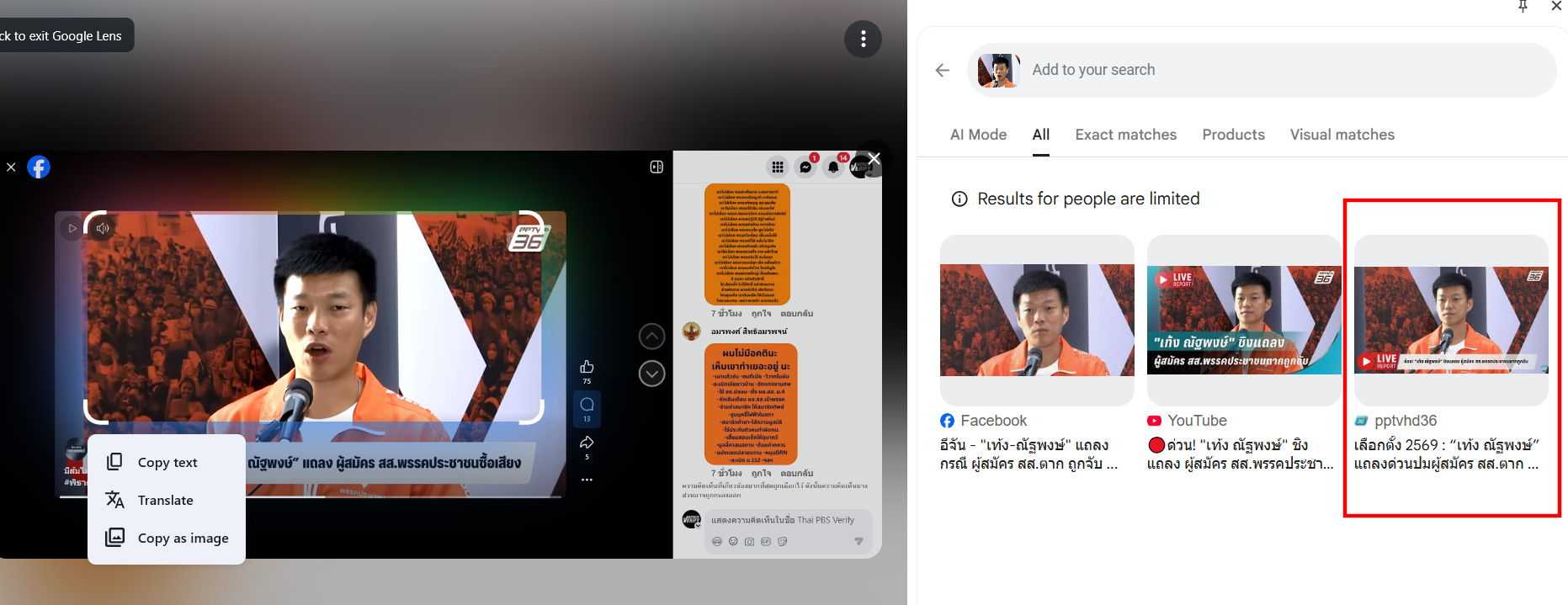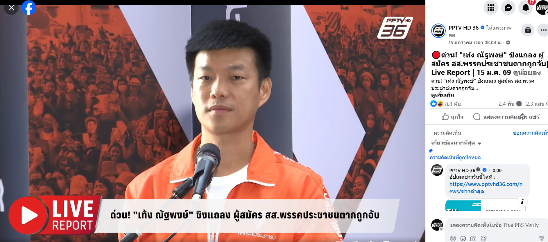 An examination conducted by Google Lens reveals that this footage derived from a PPTV news report. The actual video shows that Mr. Natthaphong spoke about the arrest of the party’s constituency candidate in Tak province. The original live stream dates back to January 15, 2026
