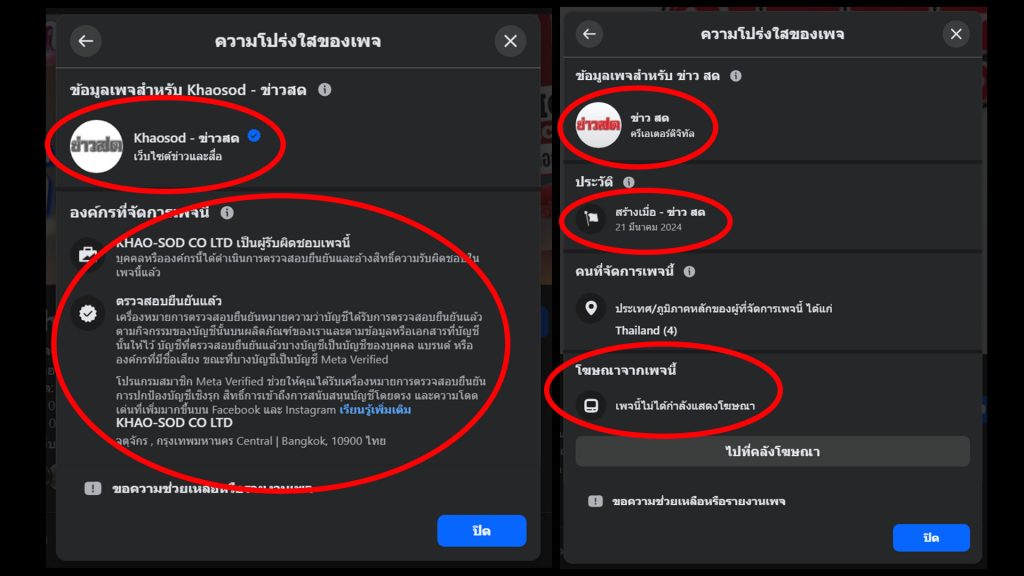 A comparison reveals the difference between the real “Khaosod – ข่าวสด” page (left) and the fake “ข่าว สด (Khao sod)” page.Later, it was found that both the fake news post and the “Khao sod” page had been deleted from the platform on February 19, 2026.