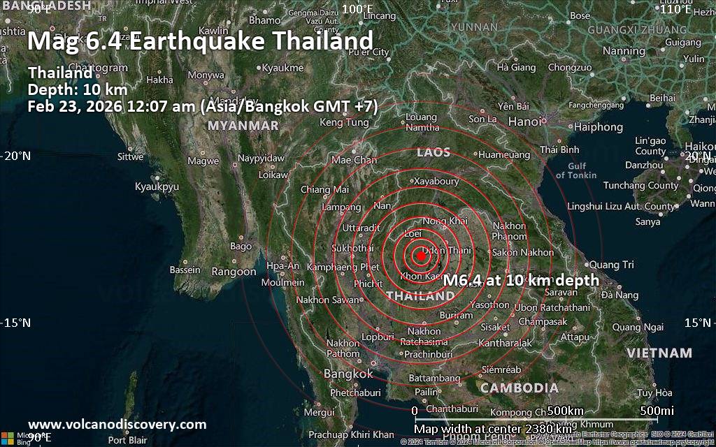 Volcano Discovery’s Magnitude 6.5 alert for Loei on February 23, 2026, was later confirmed as a false report.