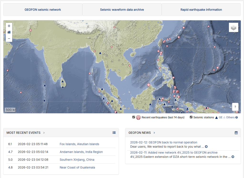 The GEOFON website displayed seismic monitoring results for the 14 days leading up to February 23, 2026.
