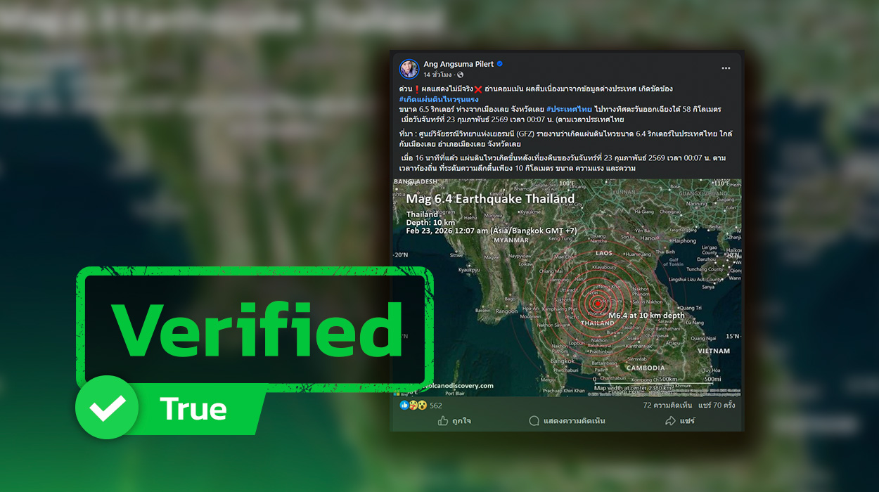 However, Thai PBS Verify found further details in the satellite images, which led to another earthquake and volcano reporting website, “Volcano Discovery.” It turned out this website had a technical error and incorrectly claimed a magnitude 6.5 earthquake hit Mueang District, Loei, at 12:07 AM on February 23, 2026