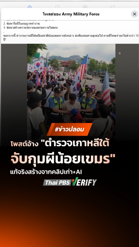 Thai PBS Verify พบโพสต์เฟซบุ๊กอ้างแรงงานกัมพูชาออกมาประท้วงเรียกร้องความยุติธรรมจนถูกตำรวจเกาหลีใต้จับ จนสื่อออนไลน์รวมถึงอินฟลูฯ ชื่อดังหลงเชื่อ นำไปเผยแพร่จนถูกแชร์ต่อนับพันครั้ง แต่จากการตรวจสอบพบเป็นเพียงภาพที่สร้างจาก AI มาผสมกับภาพเหตุการณ์เก่าเพียงเท่านั้น