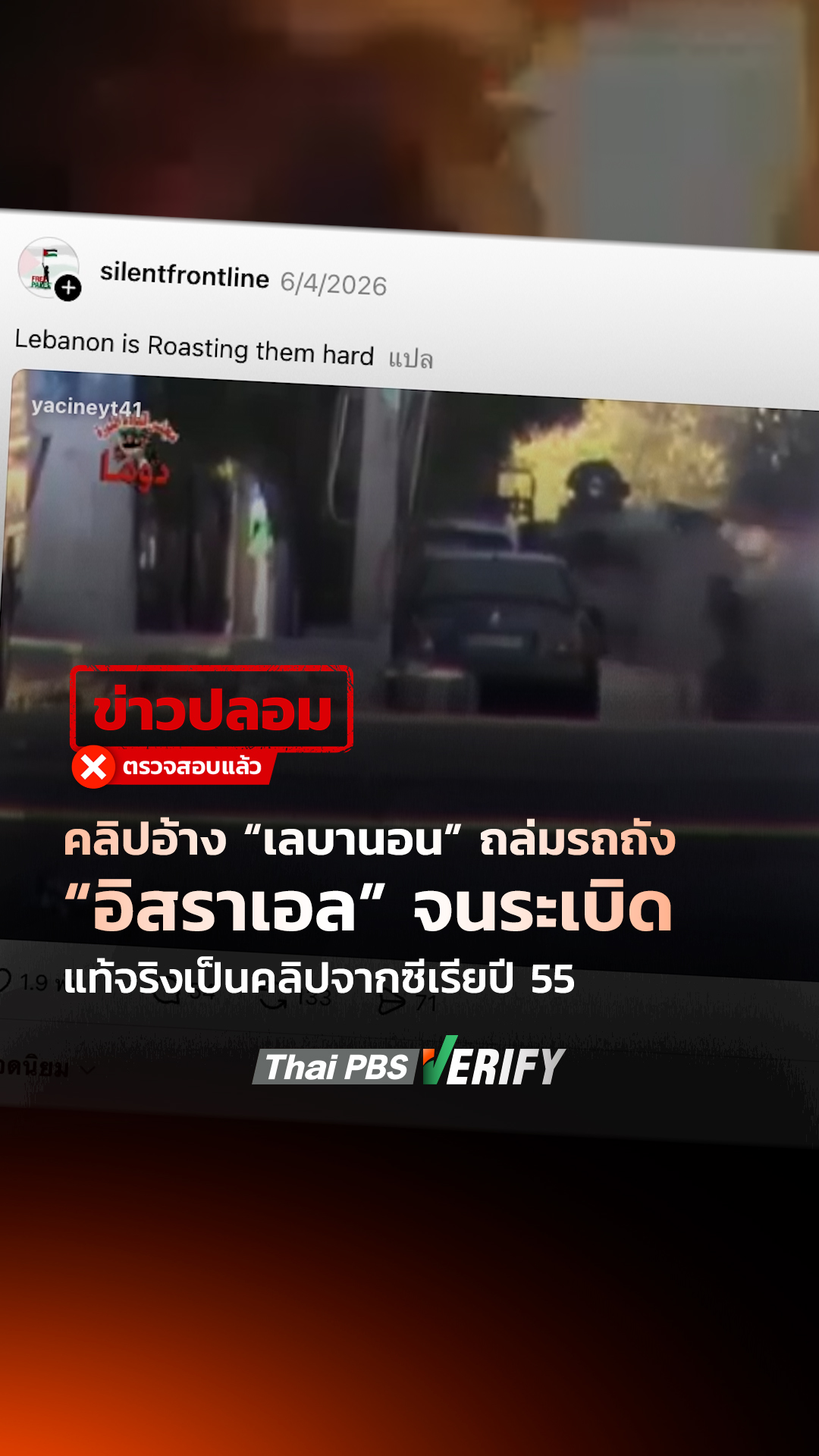 คลิปอ้าง “เลบานอน” ถล่มรถถัง “อิสราเอล” จนระเบิด แท้จริงเป็นคลิปจากซีเรียปี 55 : Thai PBS Verify