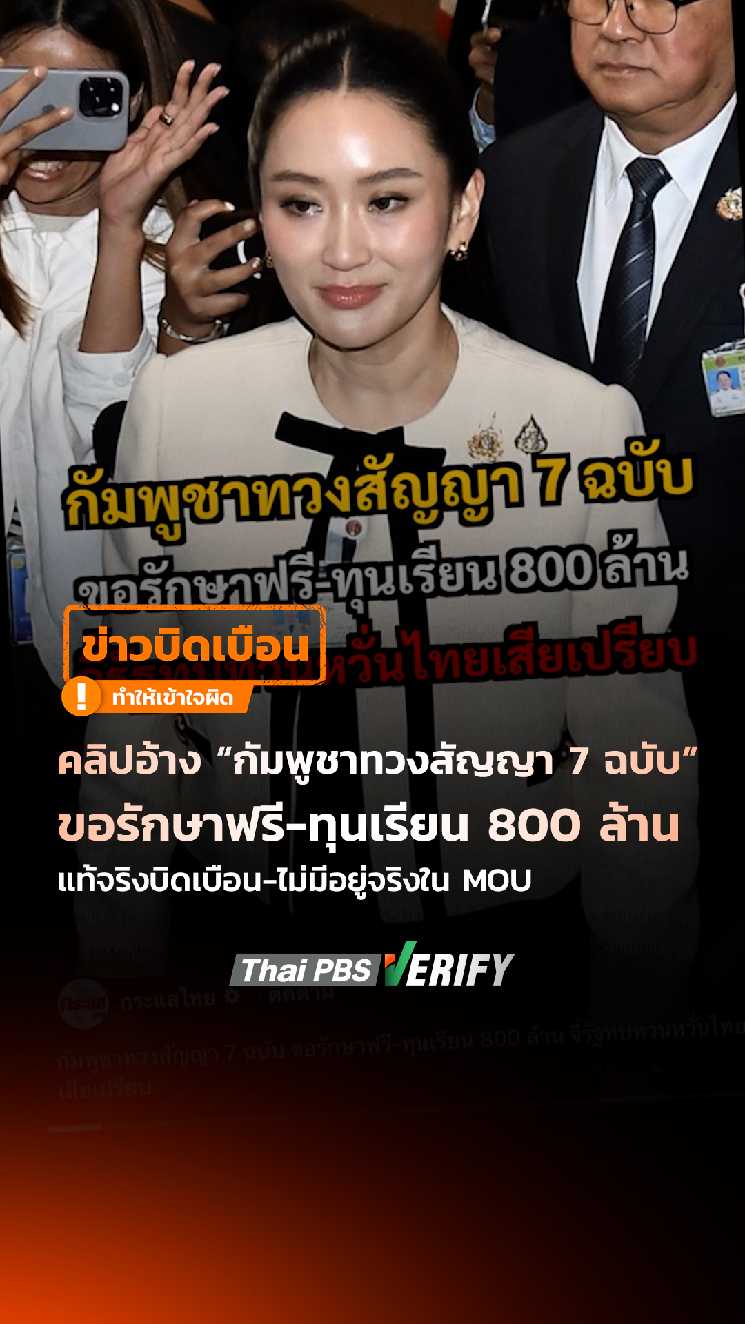 คลิปอ้าง “กัมพูชาทวงสัญญา 7 ฉบับ” ขอรักษาฟรี-ทุนเรียน 800 ล้าน แท้จริงบิดเบือน-ไม่มีอยู่จริงใน MOU : Thai PBS Verify
